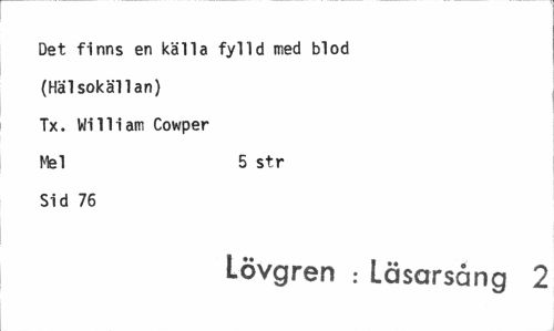 //// Det finns en källa fylld med blod //// (Hälsokällan) //// Tx. William Cowper //// Mel 5 str //// Sid 76 //// Lövgren : Läsarsång 2 ////