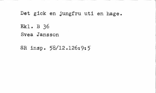 //// Det gick en jungfru uti en hage. //// Ekl. B 36 Svea Jansson //// SR insp. 58/12.126:91? ////