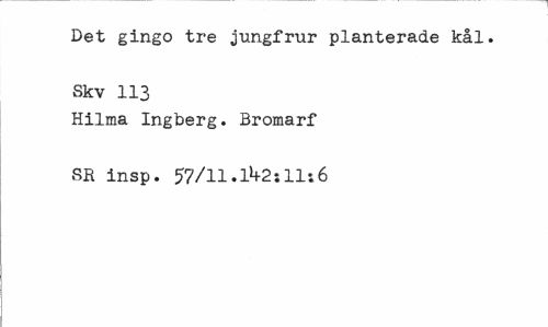 //// Det gingo tre jungfrur planterade kål. Skv 113 //// Hilma Ingberg. Bromarf SR insp. 57/1 l.l>+2i 11 6 ////