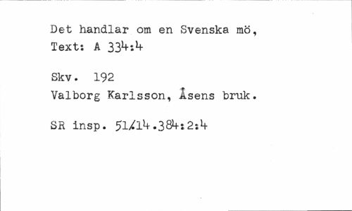 //// Det handlar om en Svenska mö, Text: A 33^.1+ //// Skv. 192 //// Valborg Karlsson, Åsens bruk. SR insp. 5l/lU.38l+:2:1+ ////
