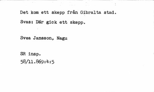 //// Det kom ett skepp från Gibralta stad. //// Svas: Där gick ett skepp. //// Svea Jansson, Nagu //// SR insp. 58/11.869:4:5 ////