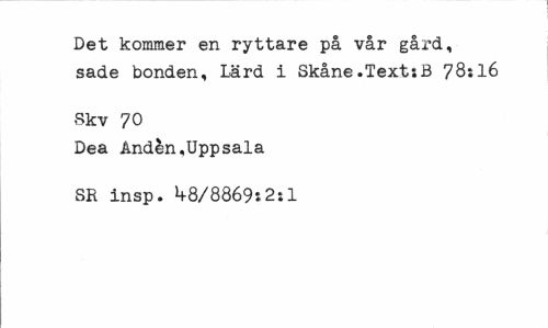//// Det kommer en ryttare på vår gård, sade bonden, Lärd i Skåne.Texts B 78:16 //// Sk v 7 0 //// Dea Ånden,Uppsala SR insp. »+8/8869i2:l ////