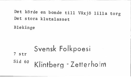 //// Det körde en bonde till Växjö lilla torg Det stora klutalasset //// Blekinge //// Svensk Folkpoesi //// 7 str //// Sid60 Klintberg-Zetterhoim ////