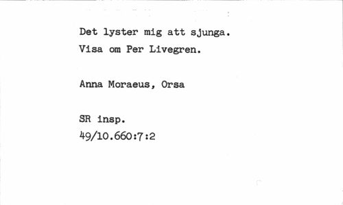 //// Det lyster mig att sjunga. //// Visa om Per Livegren. //// Anna Moraeus, Orsa //// SR insp. 49/10.660:7:2 ////