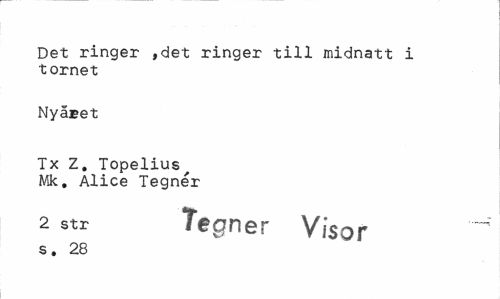 //// Det ringer ,det ringer till midnatt i tornet //// Nyåeet //// Tx Z. Topeliusf Mk. Alice Tegnér //// 2 str Tegnér Visor ^ //// s. 28 ////