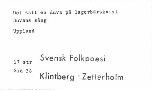 //// Det satt en duva på lagerbärskvist Duvans sång //// Uppland //// 17 str Svensk Folkpoesi //// Sid 28 //// Klintberg - Zetterholm ////