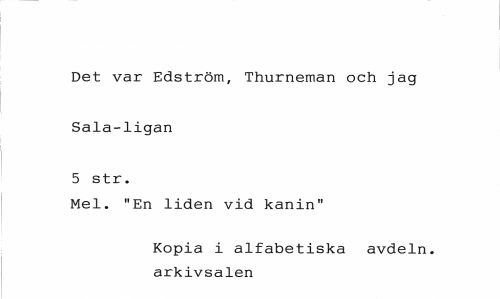 //// Det var Edström, Thurneman och jag Sala-ligan 5 str. //// Mel. "En liden vid kanin" //// Kopia i alfabetiska avdeln. arkivsalen ////