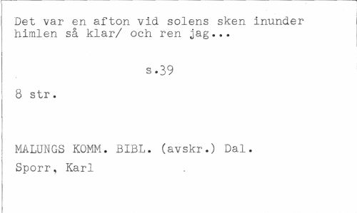 //// Det var en afton vid solens sken inunder //// himlen så klar-/ och ren jag... //// s.39 //// 8 str. //// MALUNGS KOMM. BIBL. (avskr.) Dal. Sporr, Karl ////