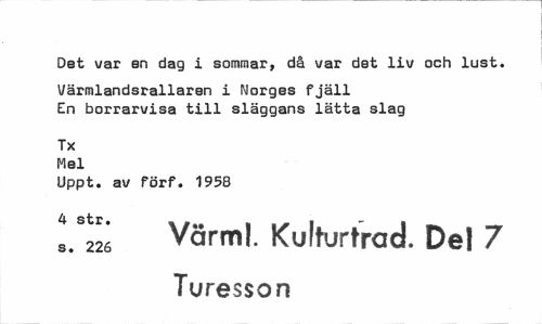 //// Det var en dag i sommar, då v/ar det liv och lust. //// Värmlandsrallaren i Norges fjäll En borrarvisa till släggans lätta slag //// Tx Mel //// Uppt. av förf. 1958 //// s. 226 Värml. Kulturtrad. Del 7 Turesson ////