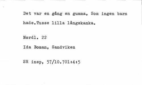 //// Det var en gång en gumma, Som ingen barn hade.Tusse lilla långskanka. //// Nordl. 22 //// Ida Boman, Sandviken SR insp, 57/10.701:4*5 ////