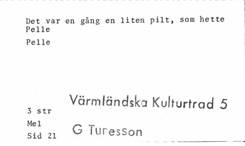 //// Det var en gång en liten pilt, som hette Pelle //// Pelle //// Värmländska Kulturtrad 5 //// 3 str //// Mel ~ T //// Sid 21 ° luresson ___ ////