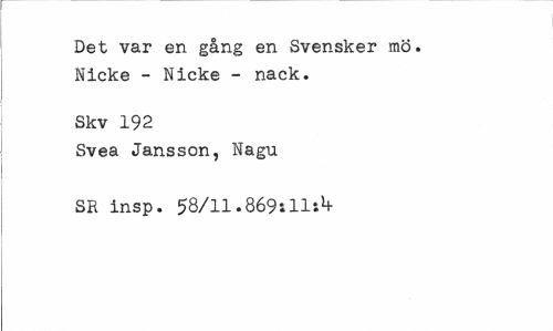 //// Det var en gång en Svensker mö. Nicke - Nicke - nack. //// Skv 192 //// Svea Jansson, Nagu SR insp. 58/11.869*11»^ ////