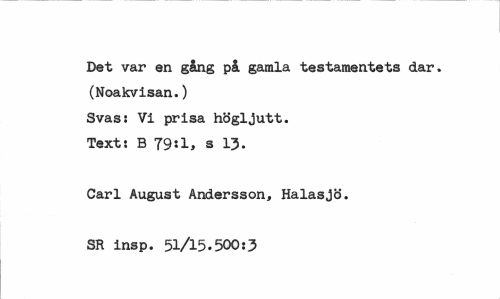 //// Det var en gång på gamla testamentets dar. (Noakvisan.) //// Svas: Vi prisa högljutt. Text: B 79*1, s 13. //// Carl August Andersson, Halasjö. //// SR insp. 51/15.500:3 ////