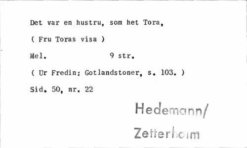 //// Det var en hustru, som het Tora, ( Fru Toras visa ) Mel. 9 str. //// ( Ur Fredin- Gotlandstoner, s. 103. ) Sid. 50, nr. 22 //// H ederna nn/ //// Zefrerhoim ////