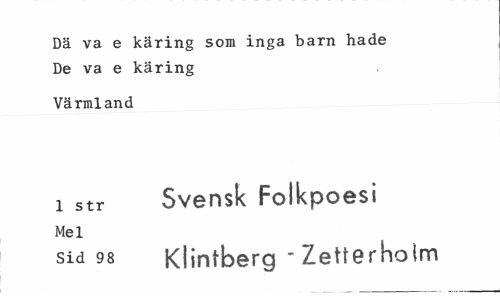 //// Dä va e käring som inga barn hade De va e käring //// Värmland //// i str Svensk Folkpoesi //// Mel //// sid 98 Klintberg -Zetterholm ////