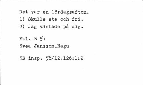 //// Det var en lördagsafton. //// 1) Skulle sta och fri. //// 2) Jag väntade på dig. //// Ekl. B 5V //// Svea Jansson,Nagu //// SR insp. 58/12.126:1:2 ////