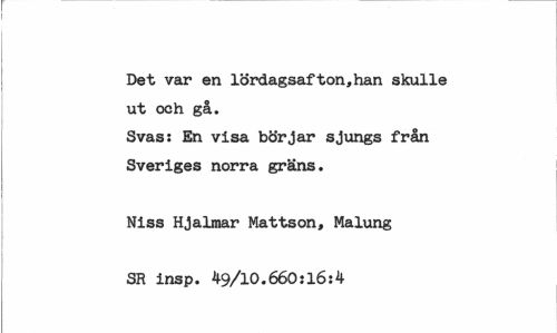 //// Det var en lördagsafton,han skulle ut och gå. //// Svas: En visa börjar sjungs från Sveriges norra gräns. //// Niss Hjalmar Mattson, Malung //// SR insp. 49/10.660:16:4 ////
