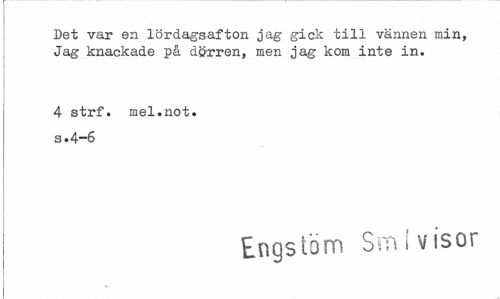 //// Det var en lördagsafton jag gick till vännen min, Jag knackade på dörren, men jag kom inte in. //// 4 strf. mel.not. s.4-6 //// tngstöm Sm I visor ////