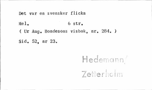 //// Det var en svensker flicka //// Mel. 6 str. //// ( Ur Aug. Bondesons visbok, nr. 284. ) //// Sid. 52, nr 23. //// H ederna nn/ //// Érm ^ * - Ö * i i O f I I I ////