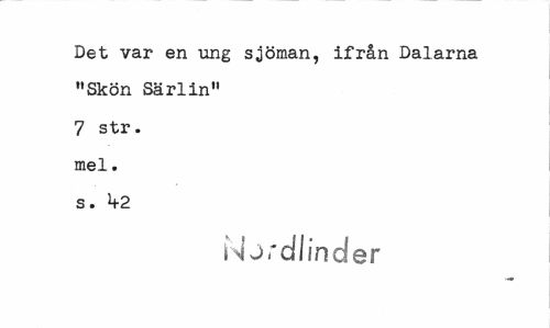 //// Det var en ung sjöman, ifrån Dalarna "Skön Särlin" 7 str. mel. s. 1*2 //// N jrdlinder ////