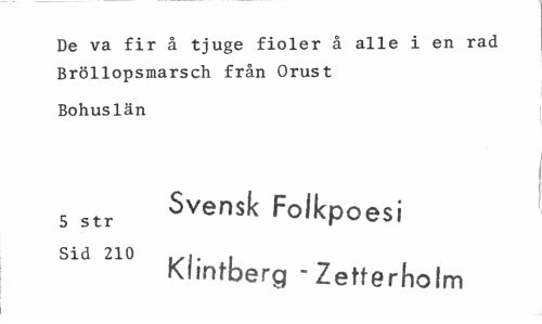 //// De va fir å tjuge fioler å alle i en rad Bröllopsmarsch från Orust //// Bohuslän //// 5 str Svensk Folkpoesi //// Sid 210 . //// Klintberg -Zetterholm ////