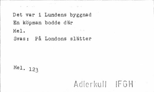 //// Det var i Lundens byggnad En köpman bodde där Mel. //// Svas: På Londons slätter Mel. 123 //// Adierkull IFGH ////