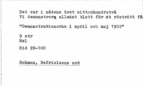 //// Det var i nådens året nittonhundratvå Vi demonstrera allmänt blott för ätt rösträtt få //// "Demonstrationerna i april och maj 1902" //// 9 str Mel //// Sid 99-100 //// Bohman, Befrielsens ord ////