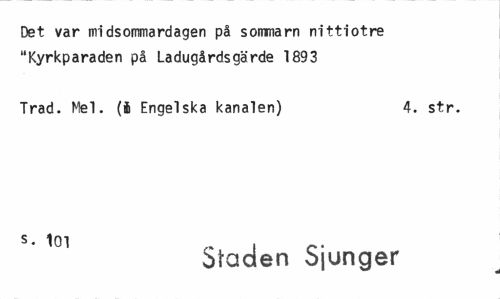 //// Det var midsommardagen på sommarn nittiotre "Kyrkparaden på Ladugårdsgärde 1893 //// Trad. Mel. (i Engelska kanalen) 4. str. //// * 101 Staden Sjunger ////