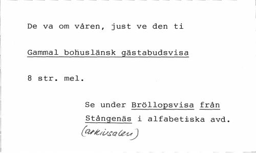//// De va om våren, just ve den ti Gammal bohuslänsk gästabudsvisa 8 str. mel. //// Se under Bröllopsvisa från Stångenäs i alfabetåska avd. //// O^/USG^J ////