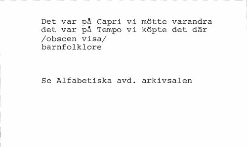 //// Det var på Capri vi mötte varandra det var på Tempo vi köpte det där /obscen visa/ barnfolklore //// Se Alfabetiska avd. arkivsalen ////