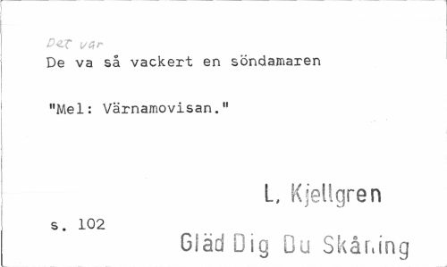 //// D*x var //// De va så vackert en söndamaren "Mel: Värnamovisan." //// L, Kjellgren //// s. 102 //// Gläd Dig Du Skåning ////