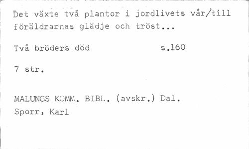 //// Det växte två plantor i jordlivets vår/till föräldrarnas glädje och tröst... //// Två bröders död s.160 //// 7 str. //// MALUNGS KOMM. BIBL. (avskr.) Dal. Sporr, Karl ////