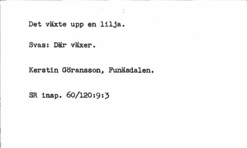 //// Det växte upp en lilja. Svas: Där växer. //// Kerstin Göransson, Punäsdalen. //// SR insp. 60/120:9:3 ////