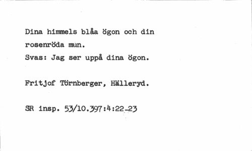 //// Dina himmels blåa ögon och din rosenröda mun. //// Svas: Jag ser uppå dina ögon. Fritjof Törnberger, Hälleryd. SR insp. 55/10.397:4:22-23 ////