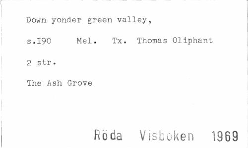 //// Down yonder green valley, //// s.190 Mel. Tx. Thomas Oliphant //// 2 str. //// The Ash Grove //// Röda Visboken 1969 ////