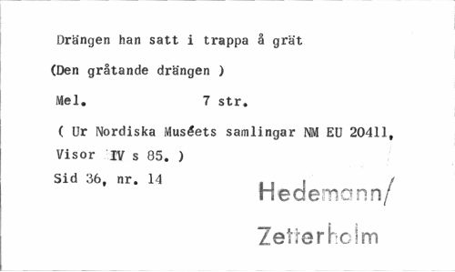 //// Drängen han satt i trappa å grät //// (Den gråtande drängen ) //// Mel. 7 str. //// ( Ur Nordiska Muséets samlingar NM EU 20411, Visor IV s 85. ) //// Sid 36, nr. 14 i i ! / //// Hedemonn/ Zetterhclm ////