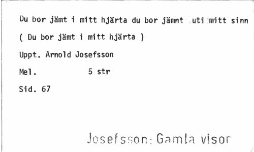 //// Du bor jämt i mitt hjärta du bor jämnt uti mitt sinn //// ( Du bor jämt i mitt hjärta ) //// Uppt. Arnold Josefsson //// Mel. 5 str //// Sid. 67 //// Josefsson: Gamla visor ////