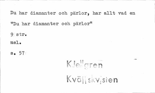 //// Du har diamanter och pärlor, har allt vad en //// "Du har diamanter och pärlor" //// 9 str. mel. //// s. 57 //// K..f6^orck n //// KyöjjSivVjSien ////