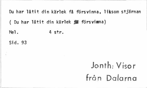 //// Du har låtit din kärlek få försvinna, liksom stjärnan ( Du har låtit din kärlek & försvinna) Hel. 4 str. //// Sid. 93 //// Jonth: Visor från Dalarna ////
