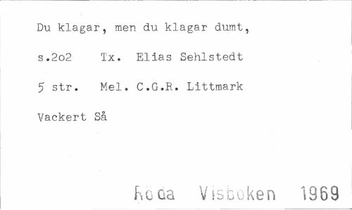 //// Du klagar, men du klagar dumt, s.2o2 Tx. Elias Sehlstedt 5 str. Mel. C.G.R. Littmark Vackert Så //// ho aa Visboken 1369 ////