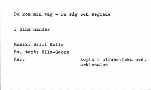 //// Du kom min väg - Du såg och segrade //// I dina händer //// Musik: Willi Kollo Sv. text: Nils-G-eorg //// Mel. Kopia i alfabetiska avd. //// arkivsalen ////