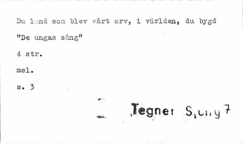 //// Du land som blev vårt arv, i världen, du bygd "De ungas sång" 4 str. mel. s. 3 //// Tegnér S.u.y* ////