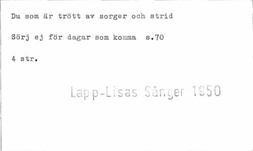 //// Du som är trött av sorger och strid Sörj ej för dagar som komma s.70 4 str. //// Lapp-Lisas Sånyer 1250 ////