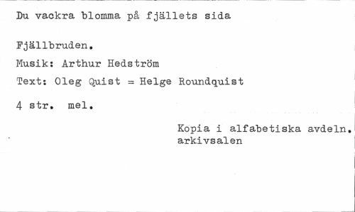//// Du vackra blomma på fjällets sida //// Fjällbruden. //// Musik: Arthur Hedström //// Text: Oleg Quist = Helge Roundquist //// 4 str. mel. //// Kopia i alfabetiska avdeln. arkivsalen ////