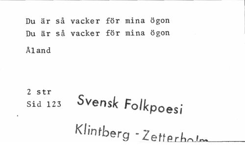//// Du är så vacker för mina ögon Du är så vacker för mina ögon //// Åland 2 str //// sid 123 Svensk Folkpoesi //// Klintberg -ZetterA^_ ////