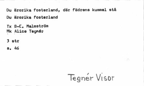 //// Du ärorika fosterland, där fädrens kummel stå Du ärorika fosterland //// Tx 8-E, Malmström Mk Alice Tegnér //// 3 str s. 46 //// "Tegner Vt^or ////