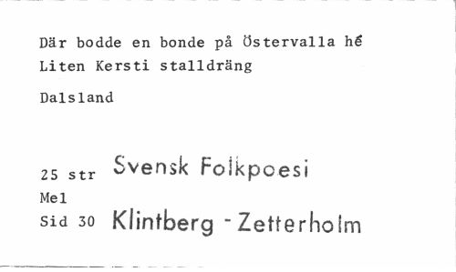 //// Där bodde en bonde på Östervalla hé Liten Kersti stalldräng //// Dalsland //// 25 str Svensk Folkpoesi //// Mel //// sid 30 Klintberg-Zetterholm ////