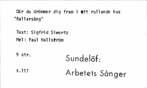 //// Där du drömmer dig fram i fctt rullande hus "Rallarsång" //// Text: Sigfrid Siwertz Mel: Paul Hal 1 ström //// 9 str' Suridelöf: //// s-117 Arbetets Sånger ////