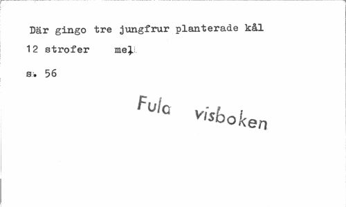 //// Där gingo tre jungfrur planterade kål 12 strofer me}.: //// s. 56 //// Fulc vicA i //// v,sooken ////