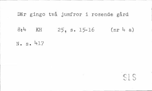 //// Där gingo två jumfror i rosende gård //// 8:*+ KH 25, s. 15-16 (nr k a) N. s. hl7 //// SLS ////